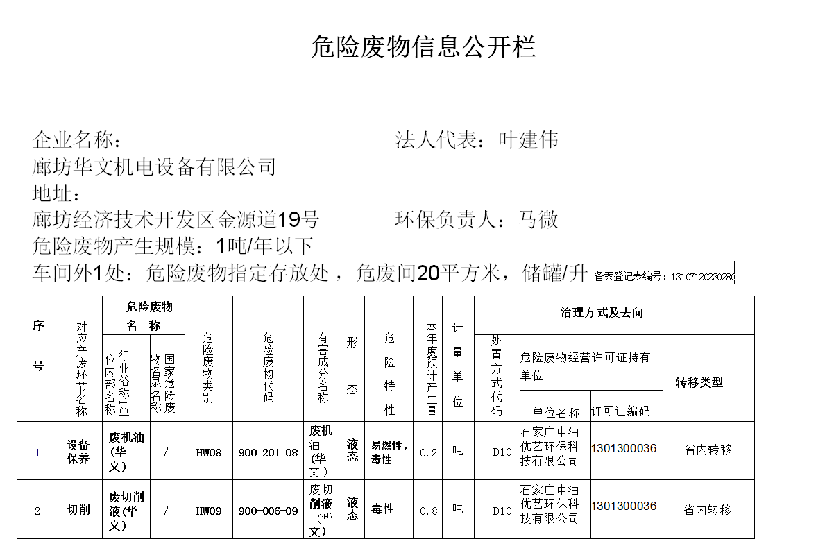 企業(yè)名稱:法人代表:葉建偉 廊坊華文機電設備有限公司 地址: 廊坊開發(fā)區花園道20號 環(huán)保負責人:張景坡 危險...